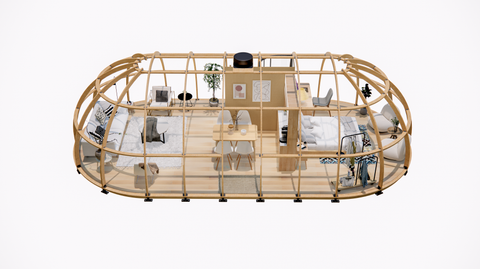 The beautifully curved plywood dome structure features 10+ windows with sunshade and skylights (optional) to create an ambient natural glow inside. The spherical shape maximizes interior living space while maintaining a compact footprint, allowing the Artemis Dome to transform into any living configuration - from a guest house and glamping tent to a functional home office or meditation studio.